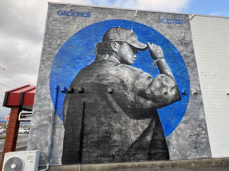 高鍋町出身のラッパー・GADORO(ガドロ)さんの2作目となる壁画が9月21日、しんきん通り(高鍋町北高鍋)に完成した。