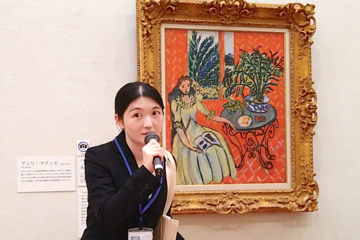 学芸員がアンリ・マティスの「赤い室内の緑衣の女」を解説する様子