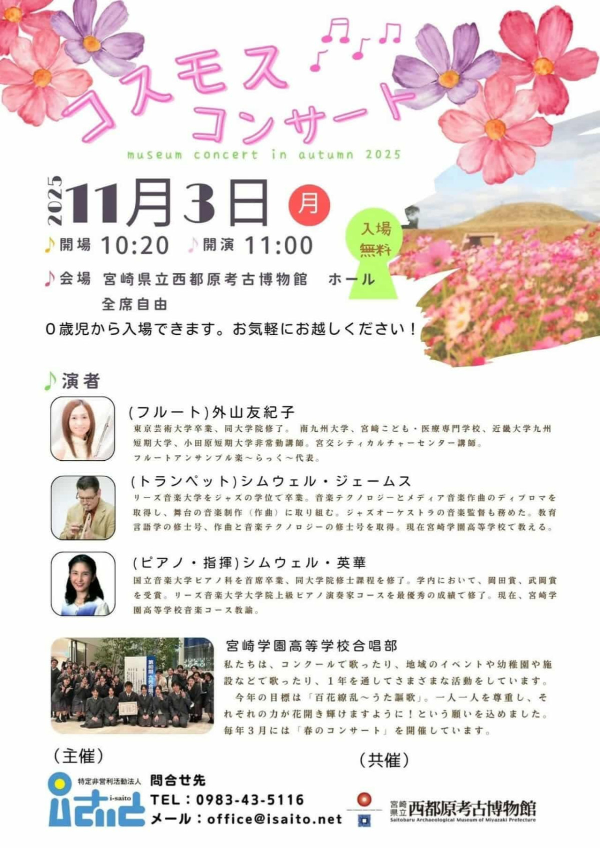 「コスモスコンサート」が11月3日、西都原考古博物館(西都市三宅西都原西)ホールで開催される。