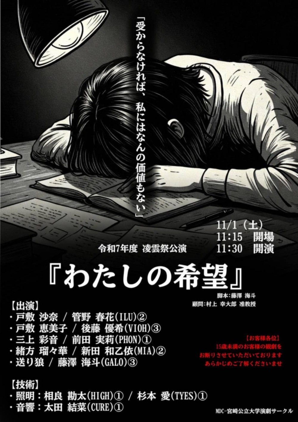 宮崎公立大学(宮崎市船塚1)の演劇サークル「MDC(エムディーシー)」が11月1日・2日、同大の学祭「令和7年度凌雲祭」で2作品を上演する。