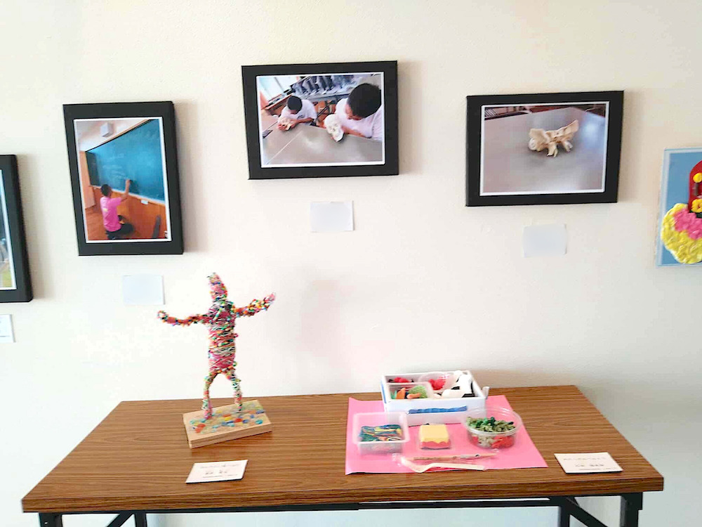 授業中の様子などを撮った写真作品や、さまざまな素材を組み合わせた小学生の作品「泣かないでヘロンを歌っているボク」(手前左)
