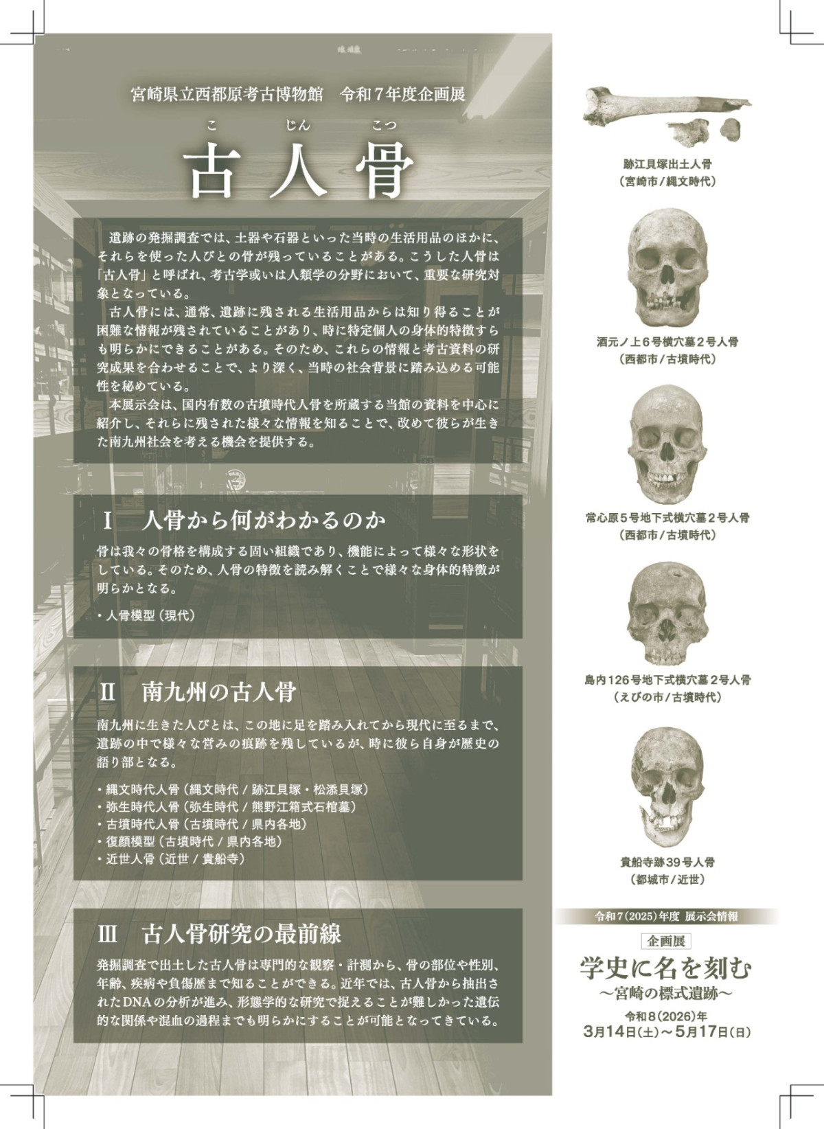 西都原考古博物館(西都市三宅)で現在、企画展「古人骨(こじんこつ)」が開催されている。