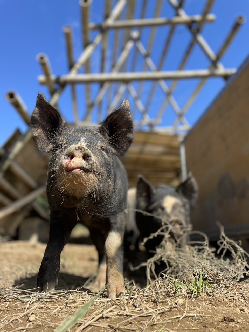 鼻先、4本の足先、尻尾の計6か所に白い毛を持つ、鹿児島県産のバークシャーという黒豚の一種、六白黒豚(写真提供=有方草太郎)