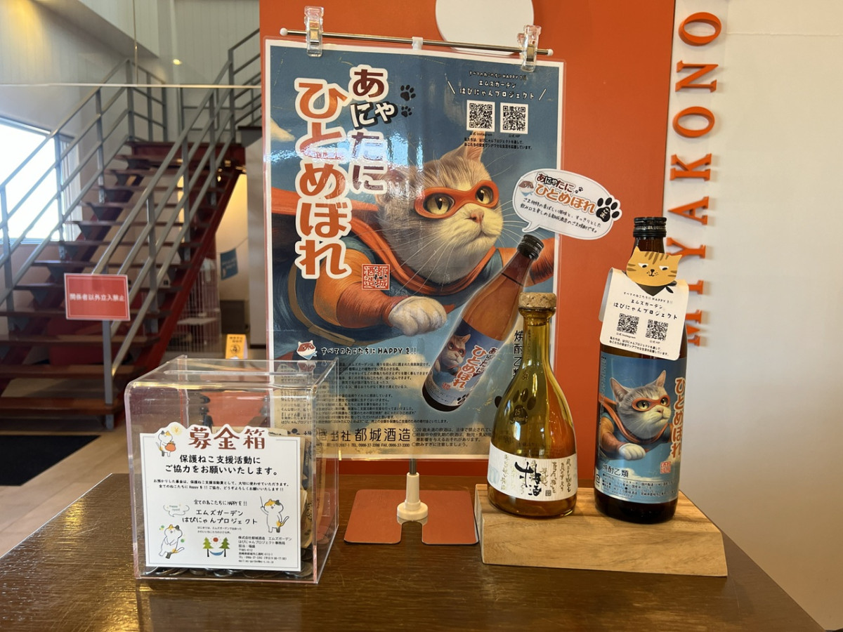 猫をモチーフにした焼酎「あにゃたにひとめぼれ」。売上金の全額を保護猫支援活動として寄付