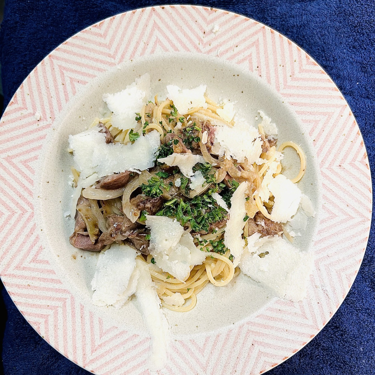 「鶏レバーと砂ずりのパルミジャーノパスタ」(写真提供=もも焼き食堂 杜季)