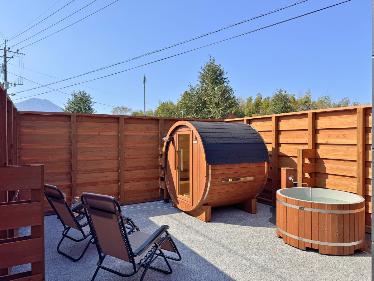 バレルサウナ、水風呂、インフィニティチェアを備えたプライベート空間