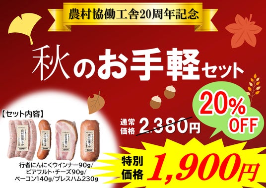 ミヤチクのハム・ソーセージブランド 「農村協働工舎」 は、 保存料や着色料を使用しない、余分なものを加えないという 「引き算のものづくり」から生まれました。2025年11月で発売20周年を迎えることができました。 日頃のご愛顧に感謝を込めて、ミヤチク直売店では11月22日(土)限定で“秋のお手軽セット”を通常価格より20%OFFの特別価格で販売いたします!この機会にぜひ、ミヤチクのハムソーセージ最高級ブランド 「農村協働工舎」の素材本来の味わいをご堪能ください。