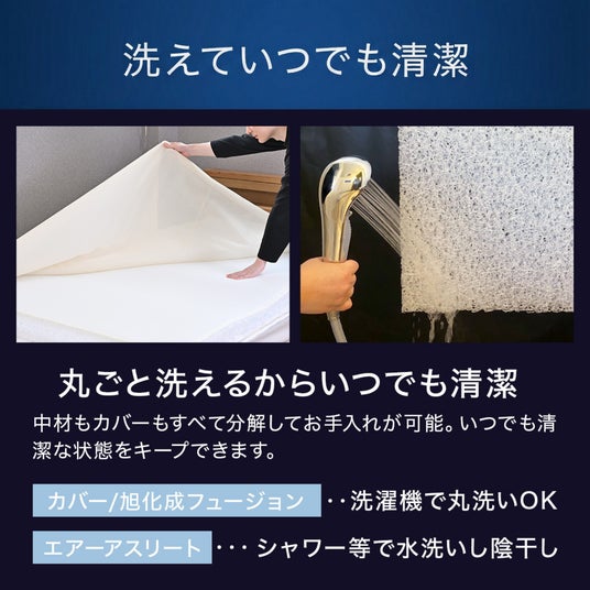 中材には、空気の層を多く含む特殊な樹脂繊維を採用しました。湿気がこもりにくいため、汗をかきやすい季節やペットと一緒に寝る方でも安心です。さらに、カバーだけでなく中材までシャワーで丸洗いが可能なため、常に清潔な睡眠環境を保てます。