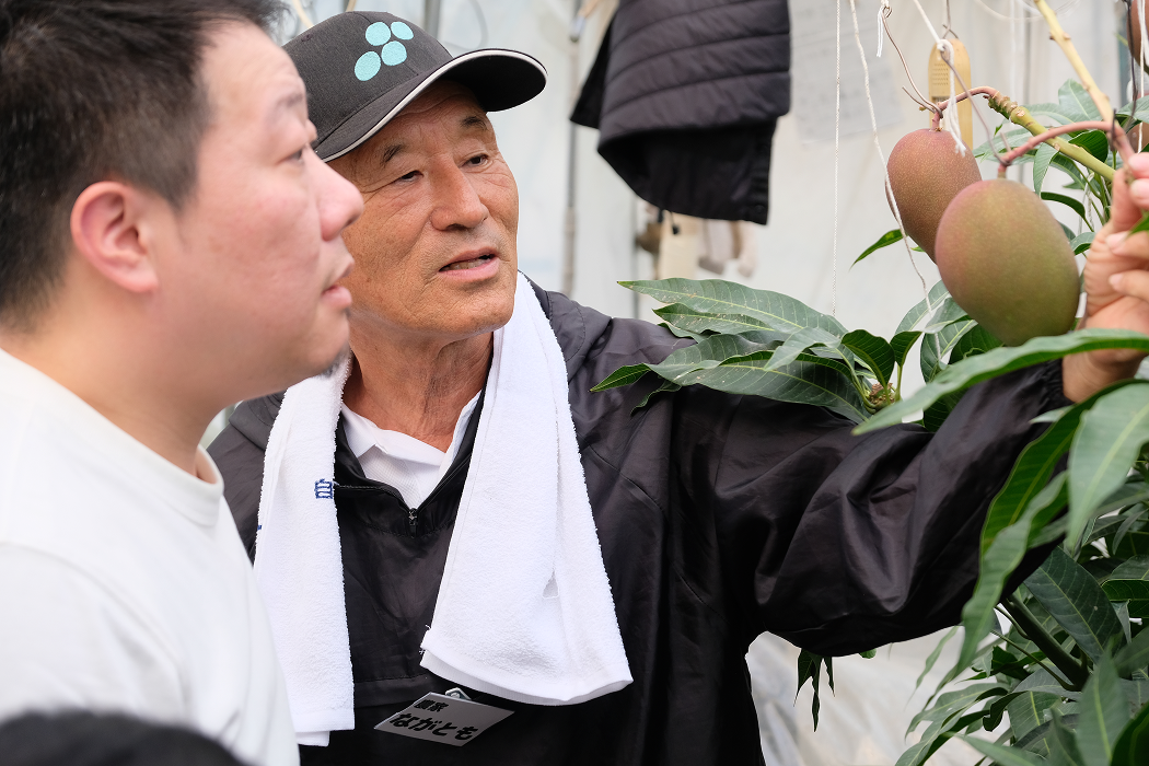 ツアー初日は、約25年の技術が詰まったアーウィン種マンゴーと極早生みかんを中心とした栽培を行う「長友農園」を訪問しました。オーナーの長友さんからは、これまでの経営の歩みやマンゴー栽培の工夫、後継者に期待することなどを直接お話しいただきました。