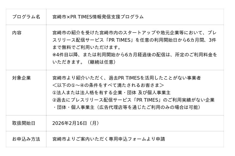 宮崎市が紹介する対象企業に対し、本来有償のPR TIMESでのプレスリリース配信を一定期間、一定枠を無償で提供します。全国のメディアや生活者へ情報を届けることで、認知を広げるきっかけとなります。