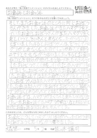一般社団法人日本昔ばなし協会が取り組む「海ノ民話のまちプロジェクト」は、2026年2月に開催した「海ノ民話の続きを考えよう!コンクール」の選考結果を発表いたしました。全国の小学生を対象に、海ノ民話アニメーションの「その先」を文章や絵で自由に描いてもらうという創造的な試みに対し、100点を超える力作が寄せられました。その後、國學院大學文学部教授・飯倉義之氏による厳正な審査を経て、子どもたちの瑞々しい想像力が光る入賞6作品を選出。古くから伝わる民話を自分事として捉え、未来へとつなげる子どもたちの想いが詰まった選考結果をお知らせいたします。